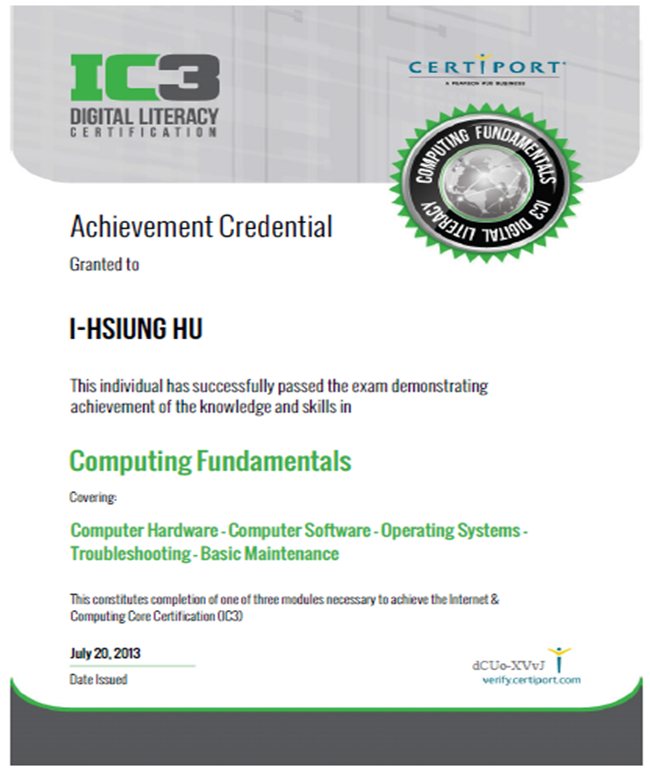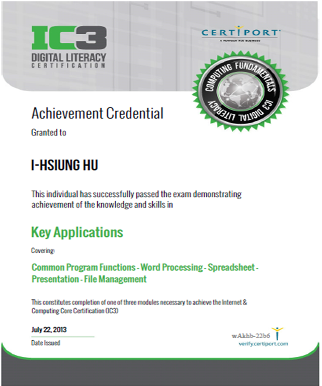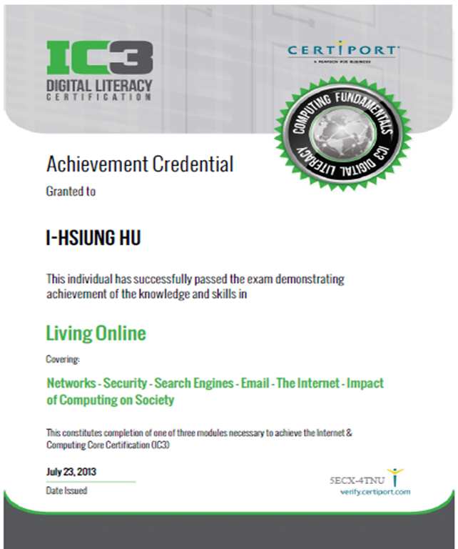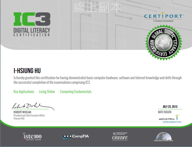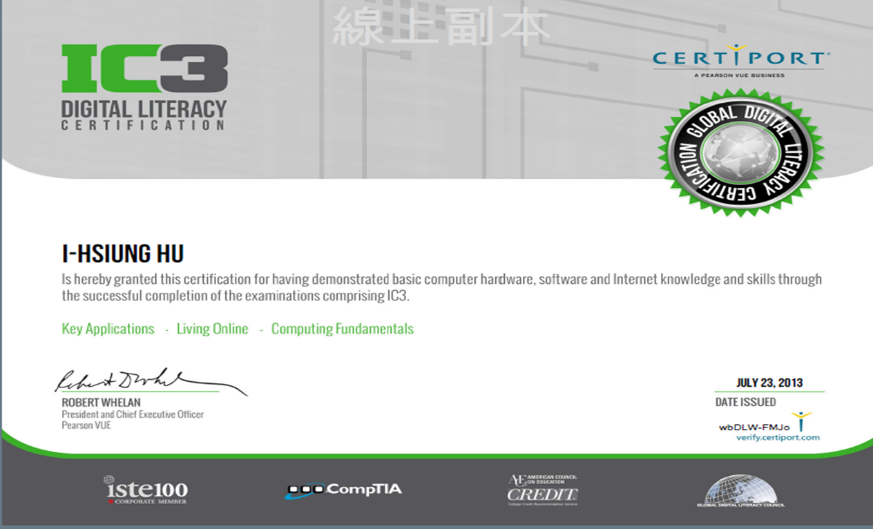IC3 GS3 國際證書樣本 |